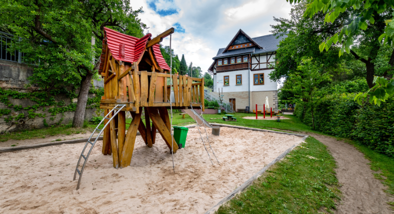 Großer naturnaher Spielplatz mit neuen Spielgeräten, Gartenbereich mit Beeten und Rodelhang unmittelbar hinter dem Gebäude.